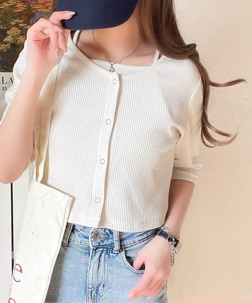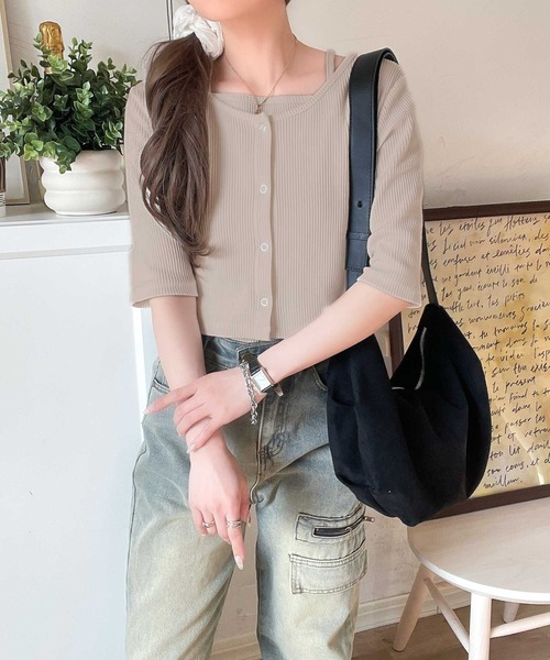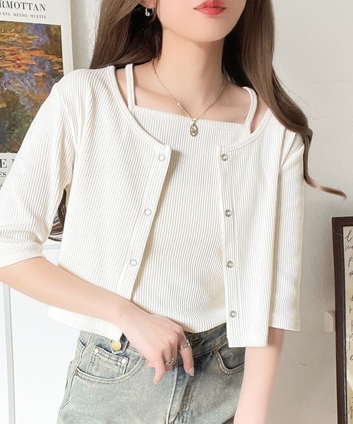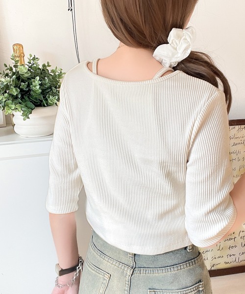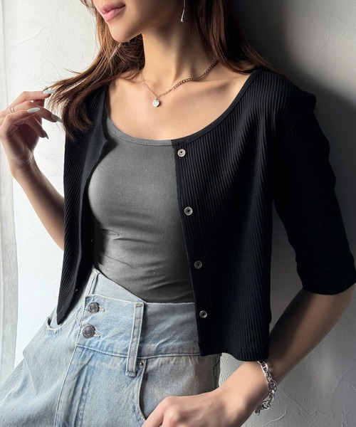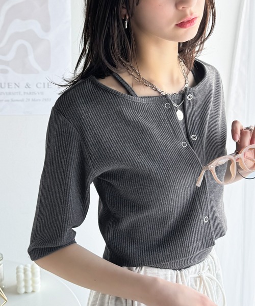 参考商品名:マルチWAYで着回し自在。5分袖テレコリブニットのマルチWAYアンサンブル